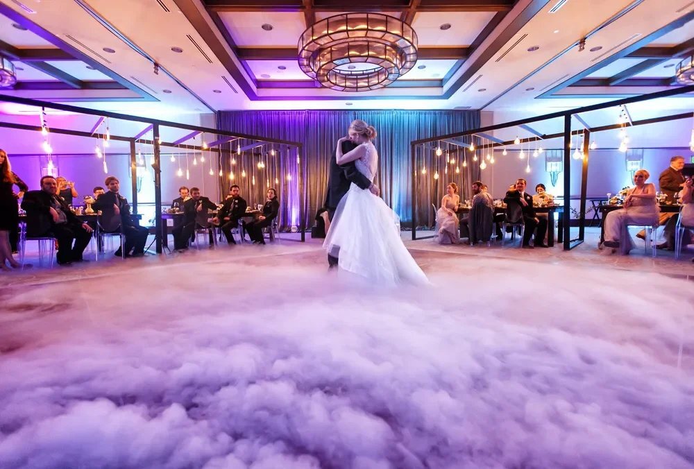 Fog machine rental for weddings, dance floors, and events, uses regular ice.